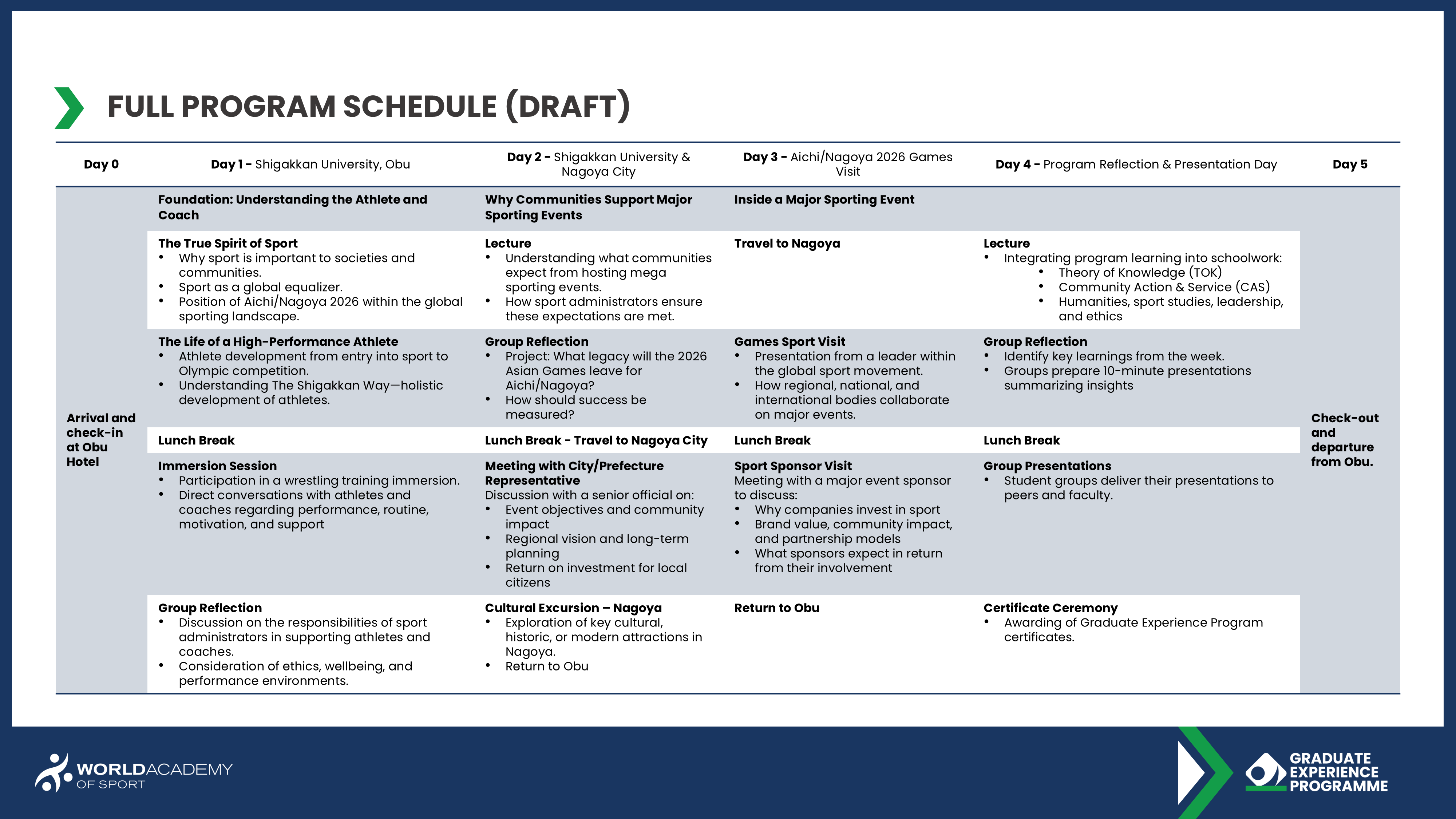The Graduate Experience Programme (GEP) is delivered by Shigakkan University and the World Academy of Sport as an independent educational programme. References to the Aichi/Nagoya 2026 environment relate to contextual learning opportunities and do not imply official partnership or guaranteed access to restricted Games-time operations.